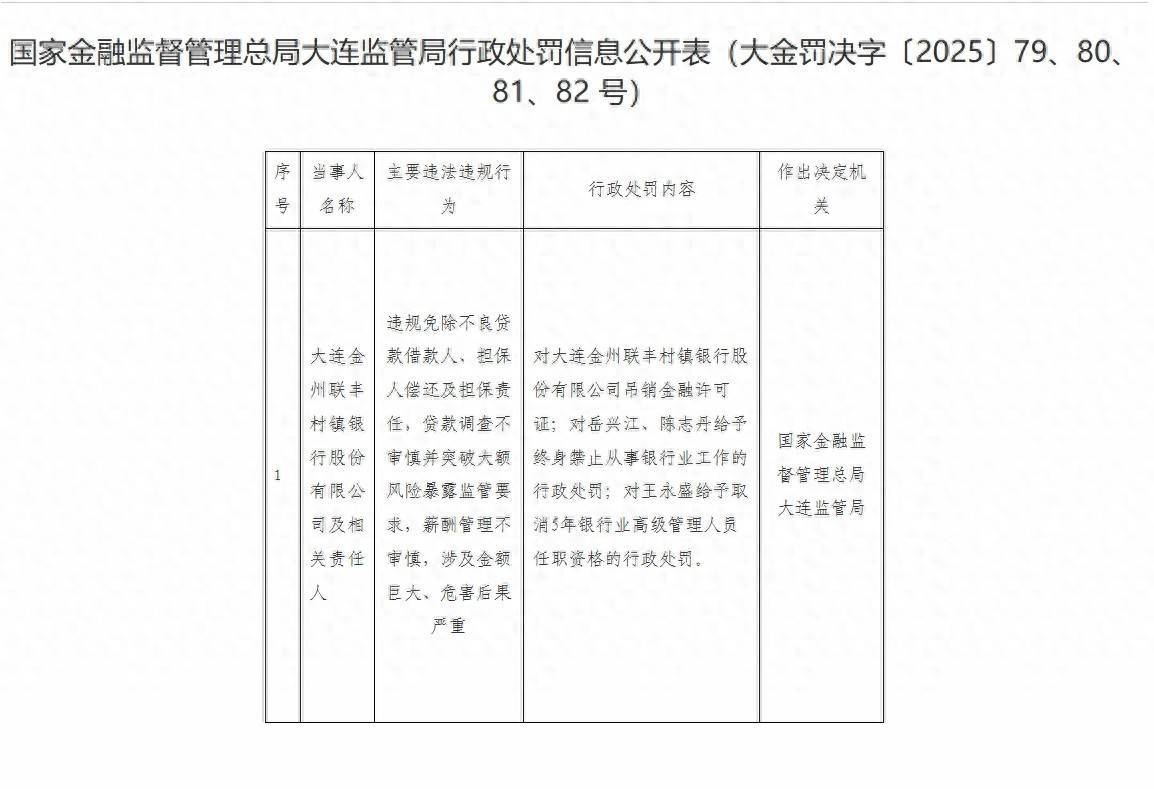 国家金融监督管理总局大连监管局对大连金州联丰村镇银行股份有限公司处以吊销金融许可证的处罚。同时,对相关责任人岳兴江、陈志丹给予终身禁止从事银行业工作的处罚,对王永盛取消5年银行业高级管理人员任职资格的处罚。(信网记者)