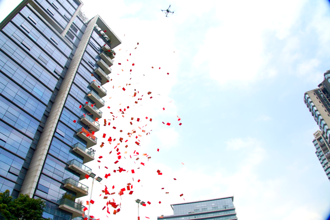 △南城企业复工首日,无人机派送“红包雨” 图:陈志谦 周琬瑜