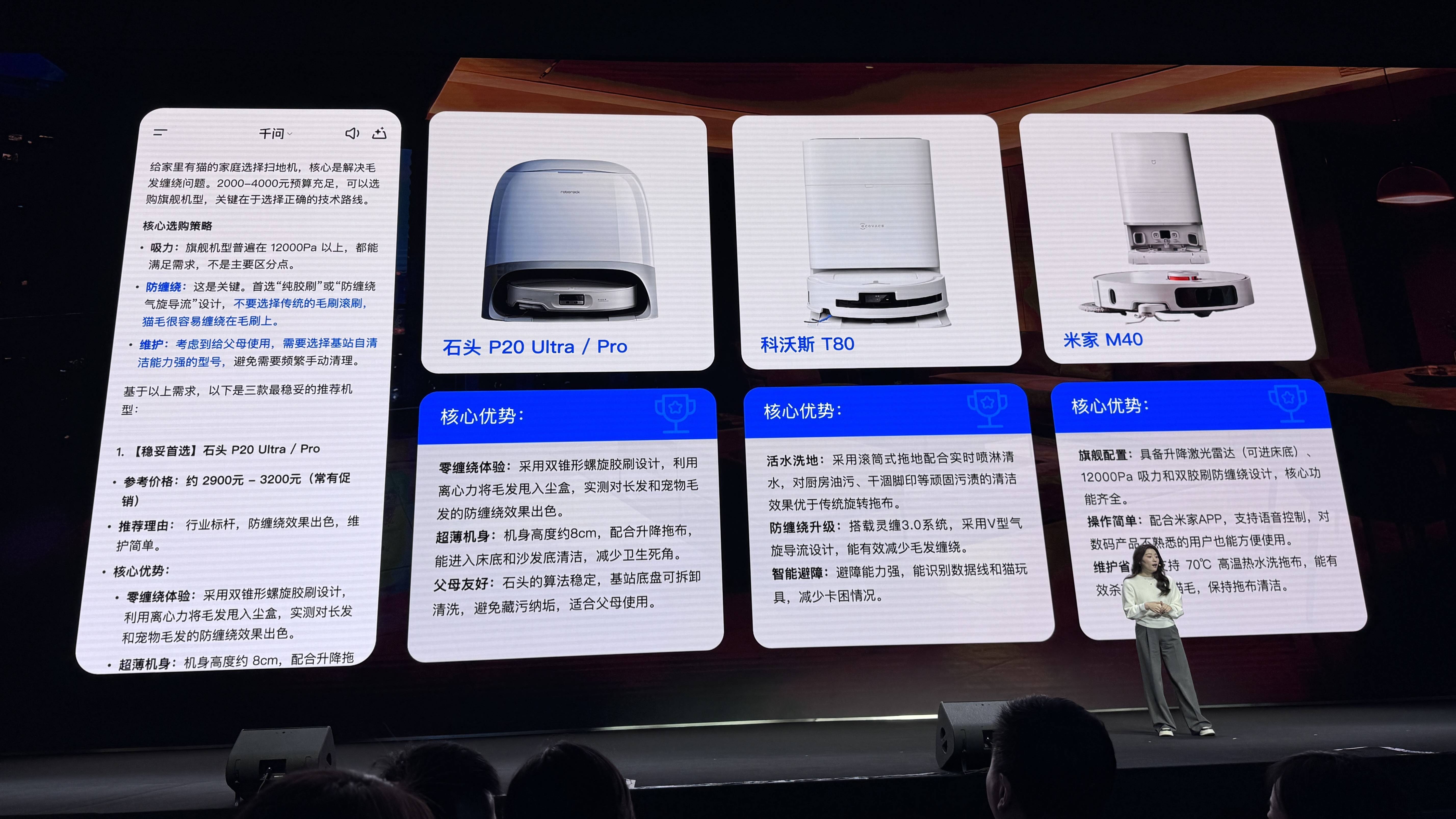 比如当用户输入为父母购买一台扫地机器人,千问能够深入理解到“家里有猫”等条件涉及的精细需求,推理出“防缠绕”、“高温杀菌”等隐含刚需,从而推荐几款更适合用户的扫地机器人。当用户点击进去,就可以看到商品详情并完成下单,省去了用户查攻略的繁琐。